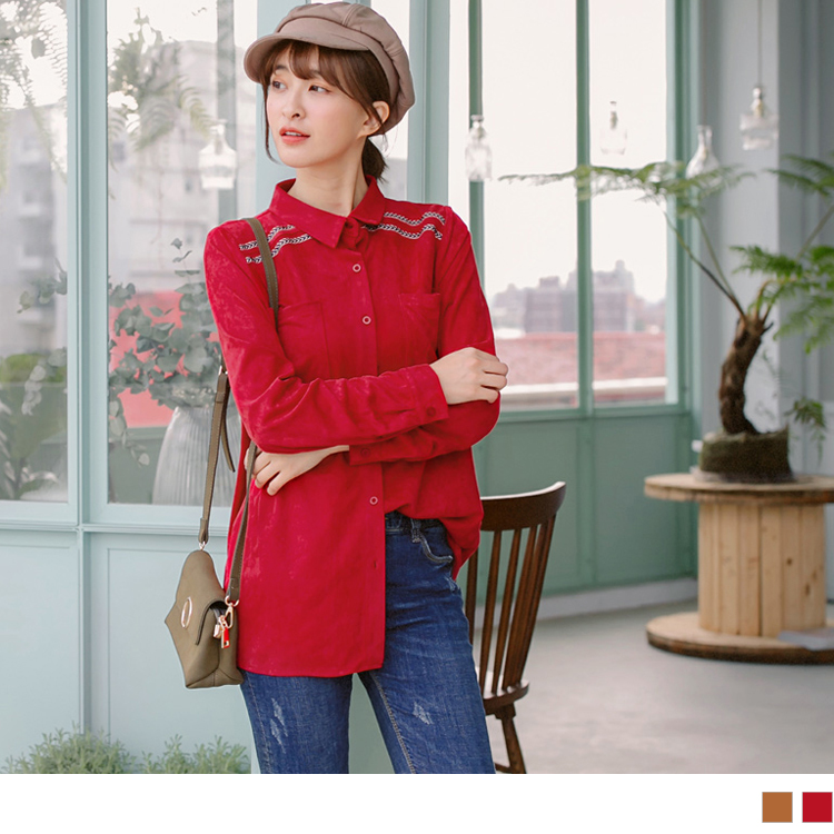 OB嚴選流行女裝OB嚴選麂皮手感民族風圖紋刺繡襯衫